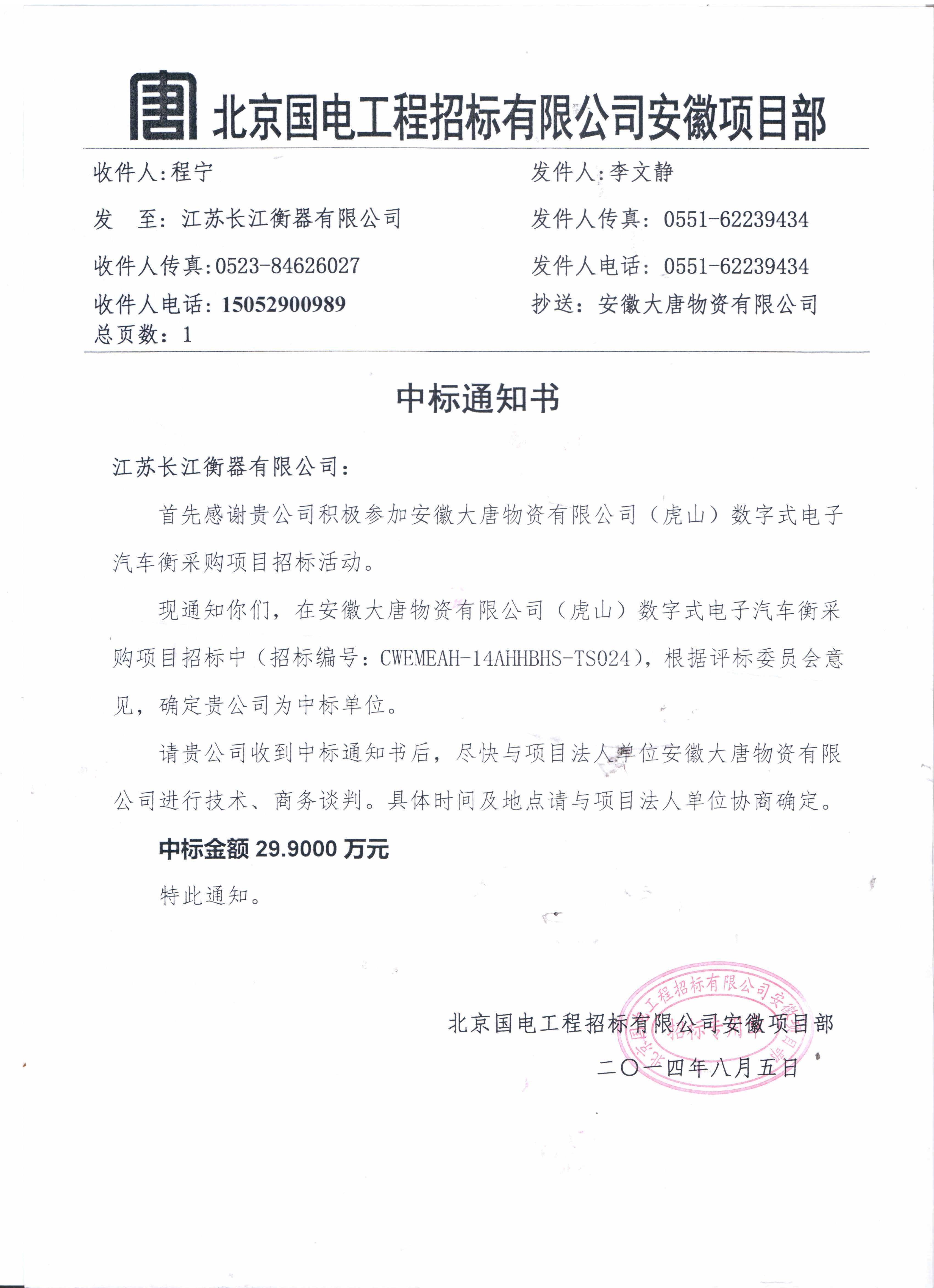 我公司很榮幸參加了北京國(guó)電工程招標(biāo)公司安徽項(xiàng)目部舉行的安徽大唐物資有限公司(虎山)數(shù)字式電子汽車衡的招標(biāo),我公司榮幸中標(biāo)!