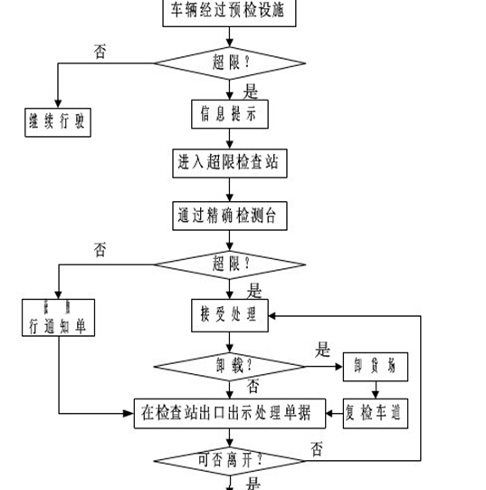 超限檢測(cè)系統(tǒng)包括稱重平臺(tái)、收尾線圈、出口欄桿機(jī)、現(xiàn)場(chǎng)控制柜、車牌識(shí)別儀、稱重主機(jī)及軟件、顯示器、信息顯示屏、設(shè)備的供電、信號(hào)傳輸電纜(信號(hào)轉(zhuǎn)換設(shè)備)。當(dāng)車輛駛?cè)霗z測(cè)車道,系統(tǒng)將自動(dòng)采集車輛的軸重、軸型、車型、速度、車牌號(hào)碼等有關(guān)信息,數(shù)據(jù)上傳到稱重主機(jī)進(jìn)行處理。稱重主機(jī)可現(xiàn)實(shí)檢測(cè)數(shù)據(jù),根據(jù)治超標(biāo)準(zhǔn)自動(dòng)識(shí)別超重車輛,自動(dòng)引導(dǎo)超重車輛進(jìn)入復(fù)檢車道。如果車輛不超重,出口欄桿機(jī)自動(dòng)抬起,允許車輛離開檢測(cè)車道。
