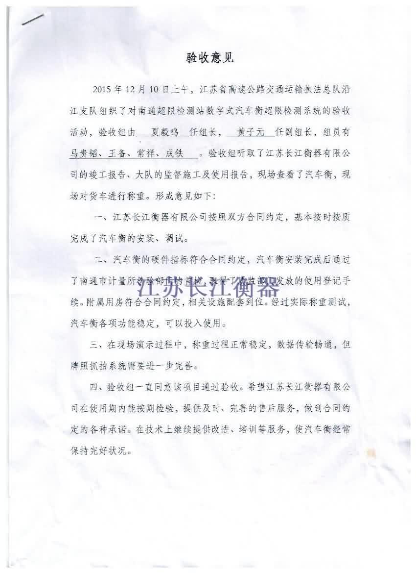 2015年12月10日上午,天空飄著小雨,江蘇省高速公路交通運輸執(zhí)法總隊沿江支隊組織了對南通超限檢測站數字式汽車衡超限檢測系統(tǒng)的驗收活動,驗收組聽取了江蘇長江衡器有限公司的竣工報告、大隊的監(jiān)督施工及使用報告,現場查看了汽車衡,現場對貨車進行稱重,并一致同意江蘇長江衡器安裝的汽車衡驗收合格。